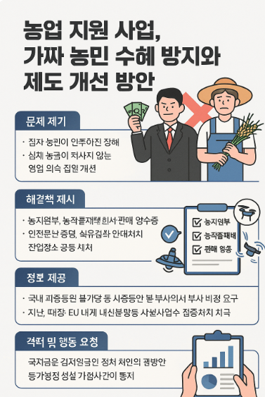 이와 함께 실제 농민을 위한 행정 지원센터를 운영해 서류 작성과 신청 절차를 지원한다면, 형평성을 높이고 진짜 농민이 지원을 온전히 받을 수 있습니다.